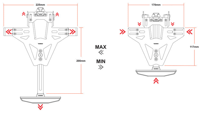 The holder is made of 2 mm laser-cut steel plate and painted to withstand weather and wind. You can adjust the tilt infinitely, and an extra locking screw ensures that nothing is loose. The indicator holders are also fully adjustable in width, with slotted 8 mm holes so you don't have to cut cables during installation. Regardless of license plate size – you can make it fit.