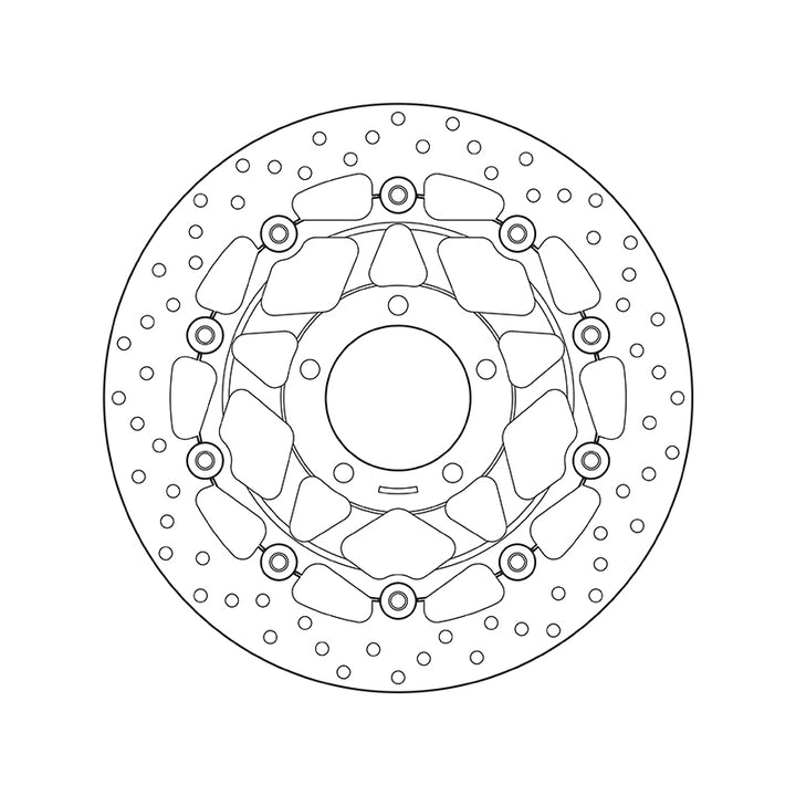 Brembo Serie Oro brake discs represent the best that the market has to offer, with a range of products boasting superlative technical content and quality. Available in both fixed and floating versions, these discs are fully interchangeable with original production discs. Floating discFloating discs are made from only the highest quality materials available to deliver unparalleled performance These consist of a braking rotor in stainless steel, connected by 10 fastener screws to an anodised aluminium alloy hat. Higher braking power Quality and performance guaranteed Efficient in all weather conditions: heat, rain, cold… Brake Disc Shape: Round Disc Type: Floating Hole Diameter (mm): ø 10.5 Inner Diameter: ø 78 Number of Holes: 5.0 Outer Diameter: ø 320 Thickness (mm): 5 mm
