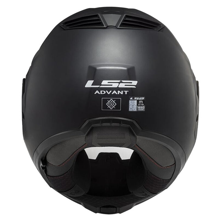 Baksidan av LS2 Öppningsbar Mc-Hjälm Advant Matt Svart, med logotyp och certifieringsmärkningar för säkerhet.