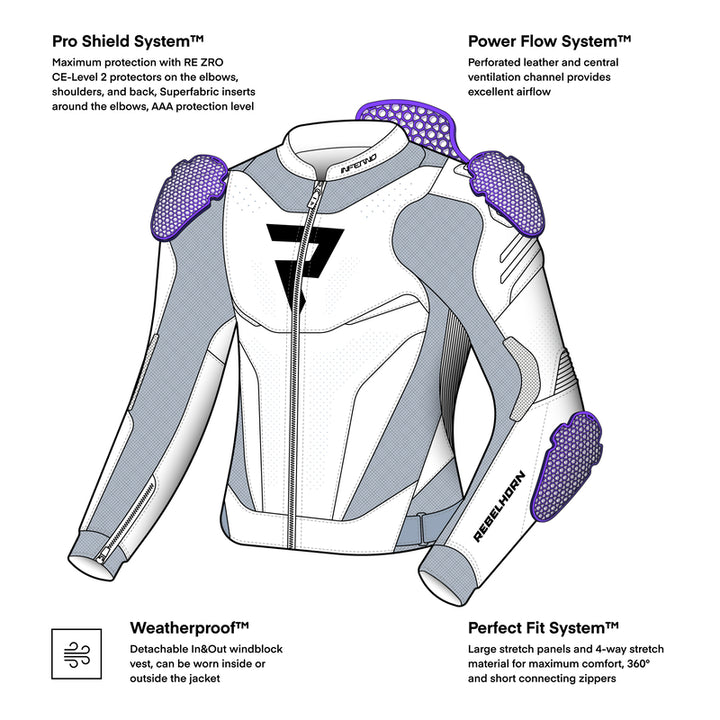 Rebelhorn Inferno is a sporty motorcycle leather jacket designed for those who love speed, curves and uncompromising protection. It is CE certified in the highest security class AAA And built for both street and track. Thanks to a combination of Soft premium nut leather, 4-way stretch material and one Removable Windblock vest Delivers both freedom of movement, comfort and protection at the absolute top level.