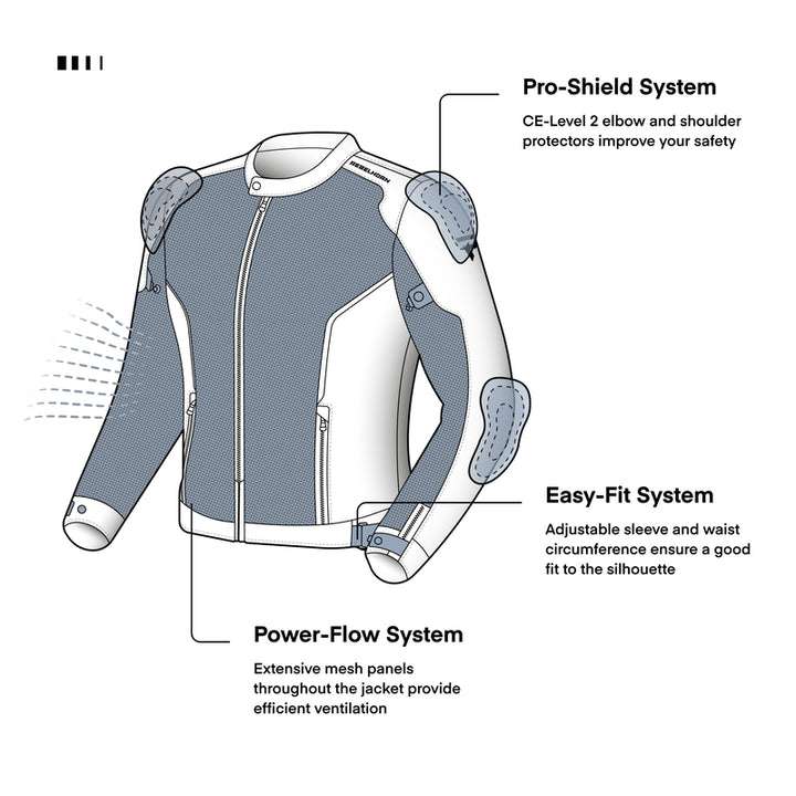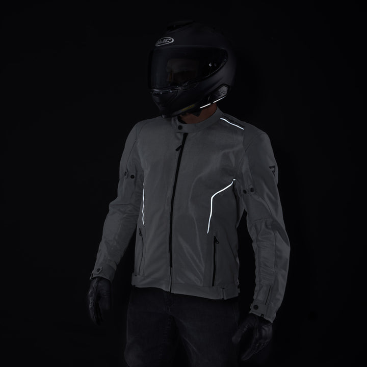 Reflex elements placed in the most exposed zones as well as shoulder and elbow protection are responsible for the safety of the motorcyclist.