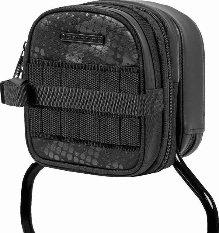 Conveniently mounts onto your sissybar pad bracket, Two zipped pockets, one of which expands, Integrated MOLLE modular attachment points for storage customization, All strap ends include our unique keepers system which eliminates the need for cutting after the bag is installed, Constructed with UV/water and Weather resistant 600 x 600 D Polyester Printed, Measures 7 "L X 5" W (Expanded) x 7-1/2 "H