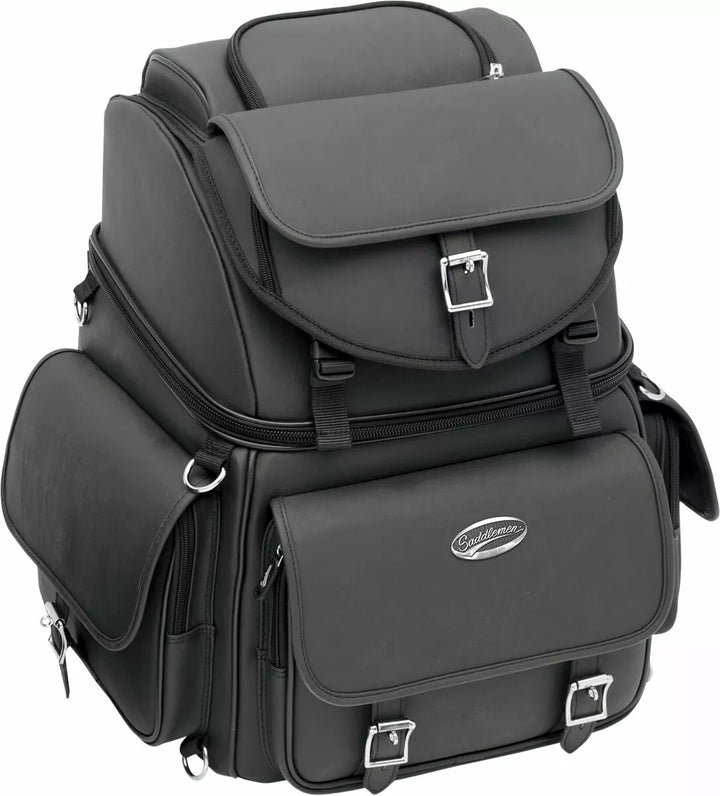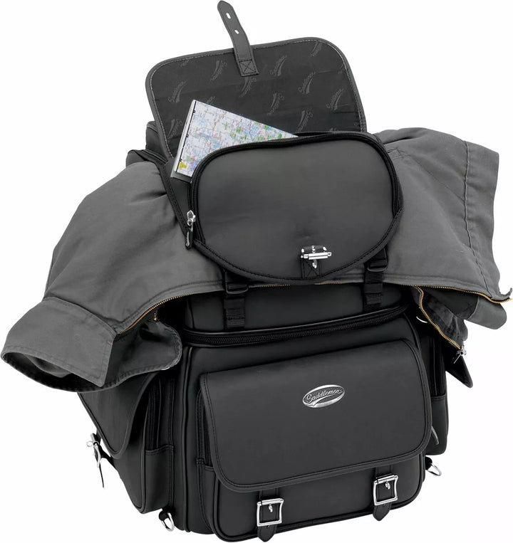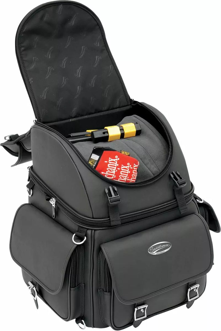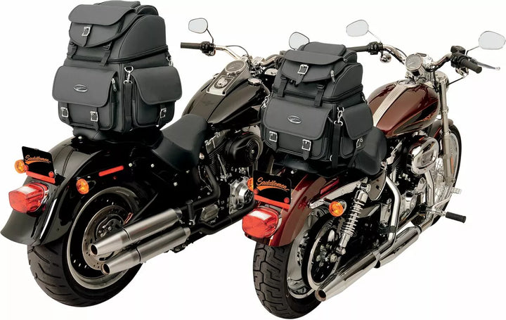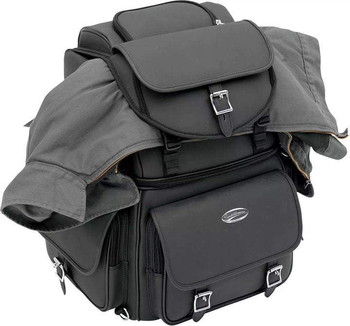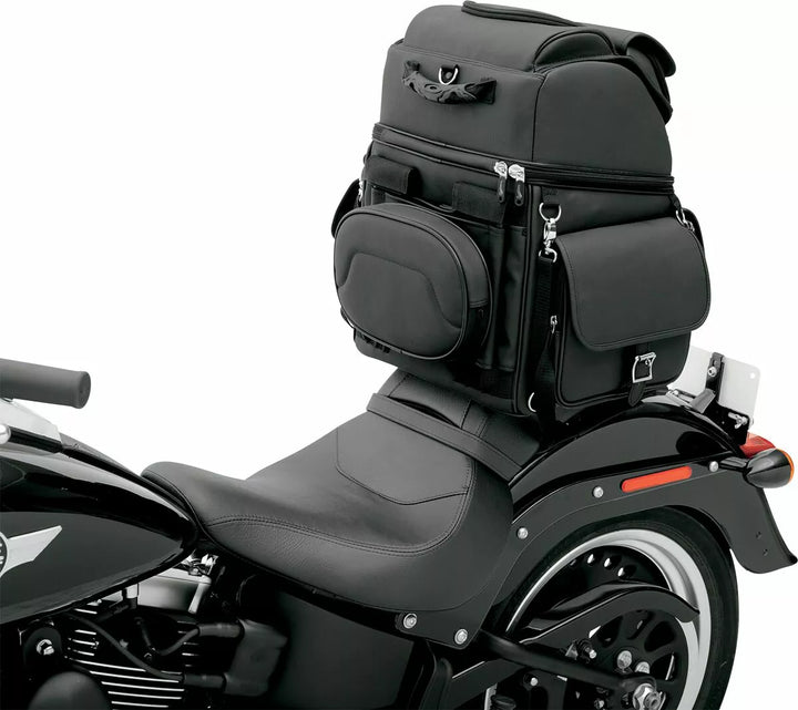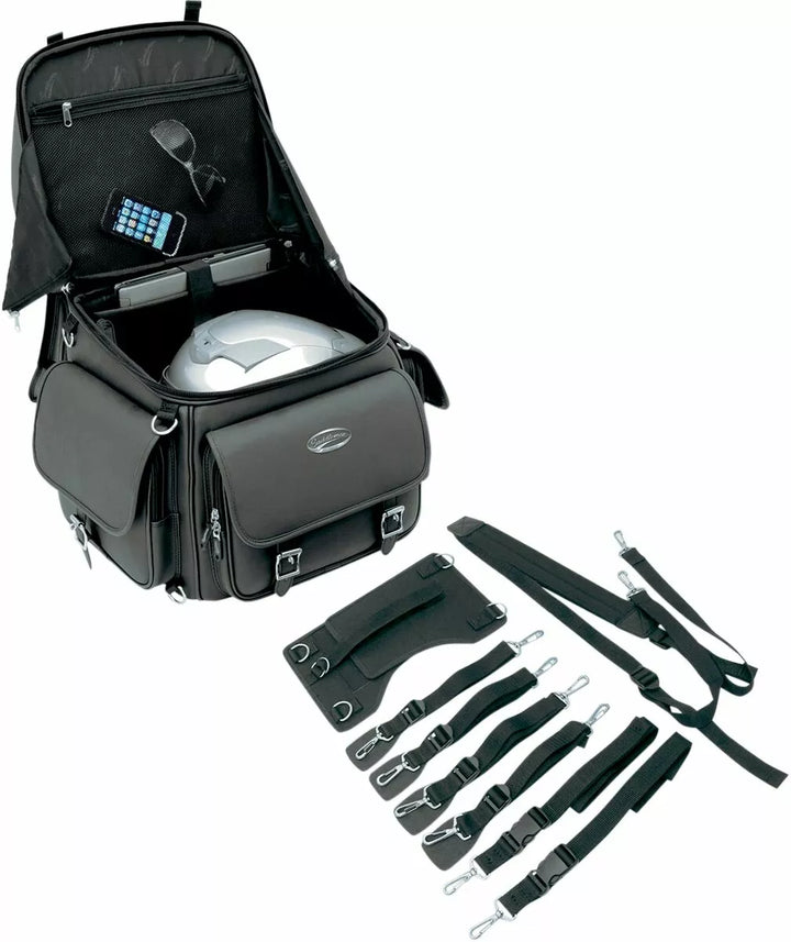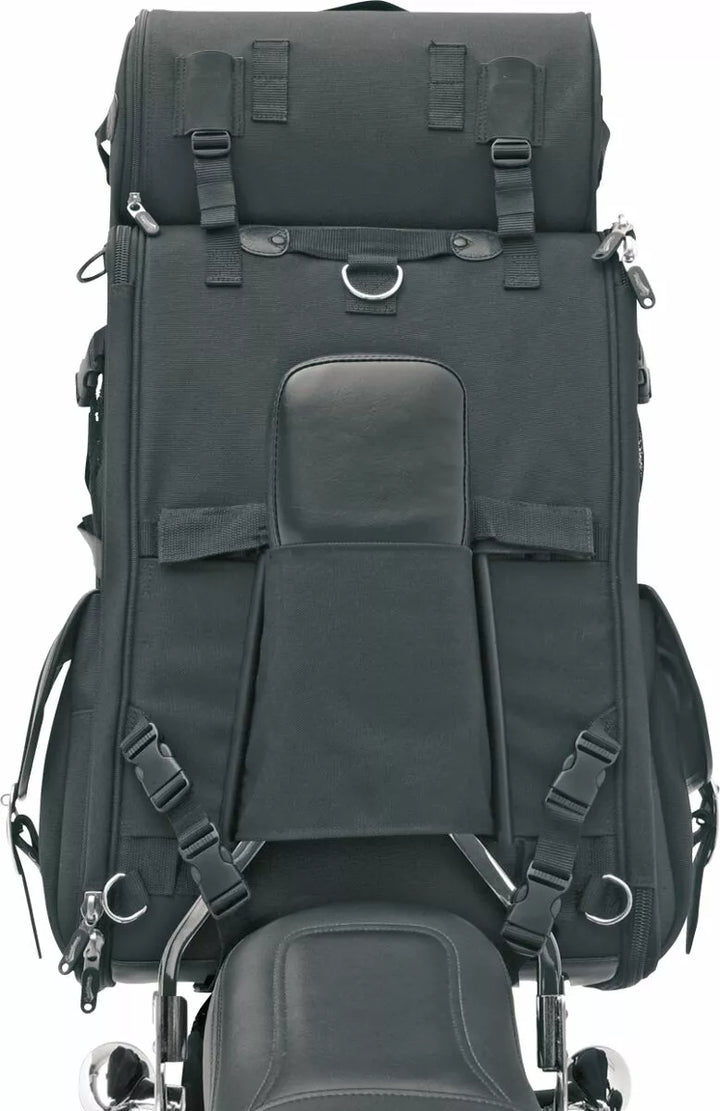 Rugged Blend of Leather-Grained Materials Looks Great On Any Type of Motorcycle, Rigid Internal Structure is Strong Enough to Lean On, Even When Empty, No Sissy Bar Required, Two Mounting Systems inc Bag to motorcycle seat, luggage rack, or sissy bar, included backrest pad can be adjusted for additional comfort for the passenger or drives, sturdy grip handle for convenient carrying, includes detachable backpack straps for easy off-the-bike jaunts, Top-Loading Main Compartment, Padded Storage Compartment Fits Small Laptop, Four External Pockets and Five Internal Mesh Pockets, Easy-to-Use Side Release Buckles On Each Strap, Decorative Chrome Chrome Buckles Provide Style, Rain Cover WITH SECURITY TETBER Adjusted to Carry A Jacket, Mini-Padlock for Security (Includes Extra Keys), Measures 14 "W X 19" H X 12 "D; 3,400 Cubic Inches Cargo Capacity; Holds One Full-Face Helmet Plus Other Cargo, EU Measurements 35.56 cm 48 cm Cargo Capacity 55.72 L, Holds One Full-Face Helmet Plus Other Cargo.