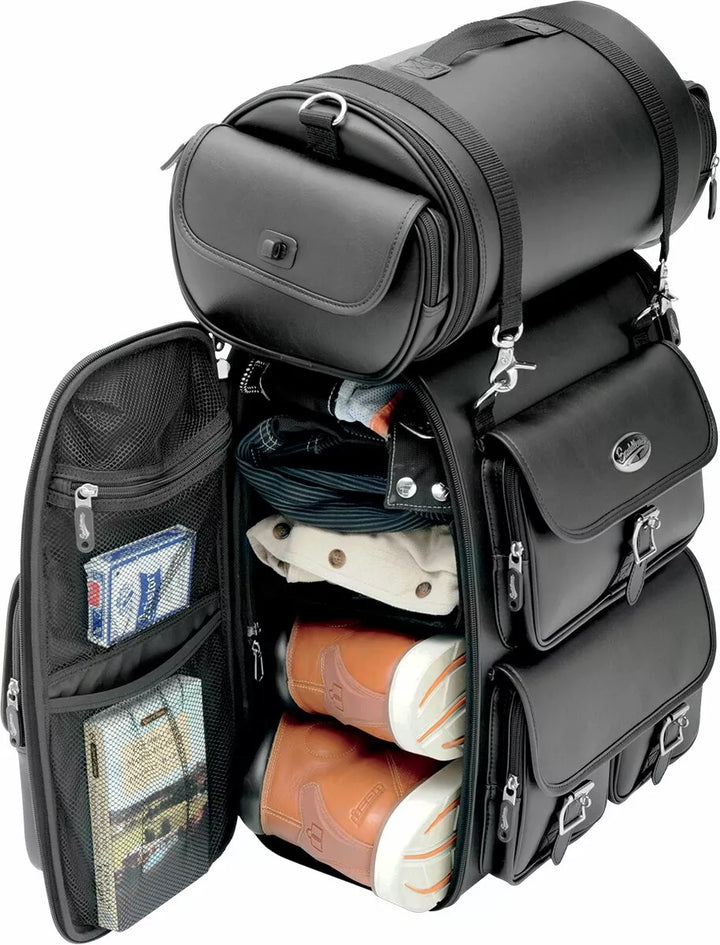 Two Full Side Openings Allow Easy Access to Bag Contents while bag is still mounted on bike, fully Adjustable sissy bar mounting system goes on in seconds over any size and style sissy bar pad; Once Adjusted for Your Size Pad, You Never Need To Adjust It Again, Rigid Construction Provides Rider Support and Can Be Leaned Back On When Mounted on Backseat, Multiple Exterior Pockets, Internal Adjustable Shelf, Raincover Leaf, constructed, constructed of Included for Extra Cargo Capacity, Dimensions: Sissy Bar Bag 15 "W X 18" H X 8 "D With Roll Bag 14" W X 8 ᄑ "H X 8 ᄑ" D