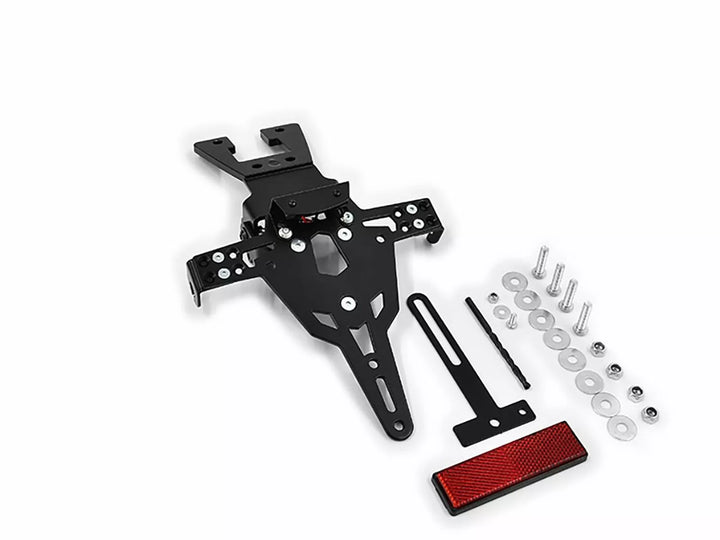 The License Plate Holder is Extremely Durable and Weather Proof., Black Powder Coated. , The License Plate Holder Can Be Used For Any Kind of License Plate (175mm Width)., No Modification of Fairing Required., Stepless Adjustment of Rake Angle., Indicator Support Adjustable in 3 Positions. Plate., Special Indicator Light Mounts (Sold Separately) Required for Stock Indicator Lights., Kit Includes: 1 License Plate Holder Incl. Mounting Kit., LED License Plate Light "e Approved" Incl. Support., Back Light With Support.