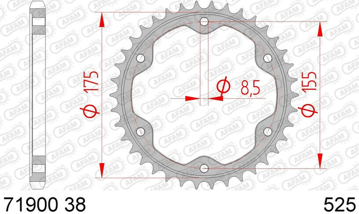Afam Steel Trojo Pro se mecanizan con acero C45 y luego se tratan con mayor dureza e incluso resistencia. El proceso de fabricación de alta calidad y la precisión de corte hicieron de AFAM un líder mundial para piezas de transmisión de motocicletas. Acero trasero trasero de fabricación de rango y contributos de calidad al kit de transmisión Durabilidad Chain_pitch: 525.0 Material: acero trasero_prolet_teeth_count: 38.0 REAR_PROET_TEPE: