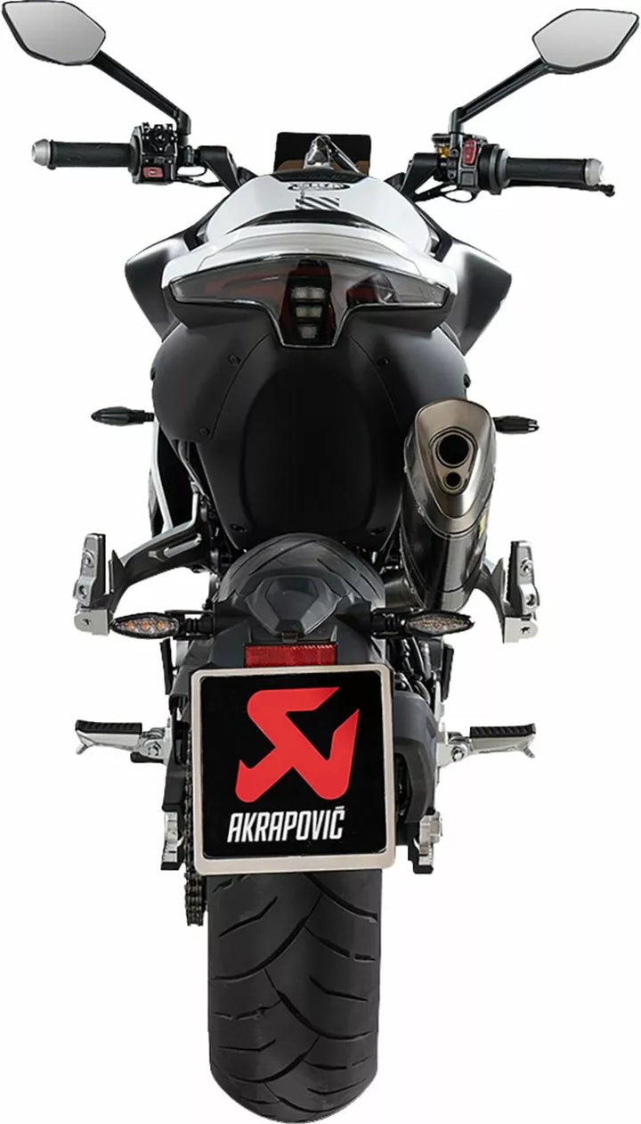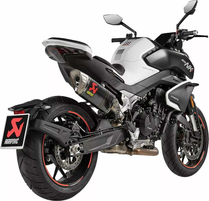 Aspecto compacto inspirado en la carrera que se integra con las líneas de bicicleta y el esquema de color, construido a partir de materiales de muestra de carrera, incluida una manga de silenciador de fibra de carbono y una pinza de silenciador, una tapa final de titanio, y un enlace kg de enlace de manchas) en comparación con el sistema de stock de stock y produce un tono de rendimiento profundo que resalta el tono de rendimiento de 799 cc, el motor de cilindros de 799 cc, se enfoca en la respuesta de la tranza, y produce un tono de rendimiento profundo que se detiene el tono de rendimiento de 799 cc, se concentra el ridiculte, la respuesta de la tranza, los ridiculios, el ridículo, el tono de rendimiento, el tono de rendimiento, el tono de rendimiento de los 799 cc, se concentra, y los ridices, se ridiculizan, y produce un tono de rendimiento de 799 cc. Particular en los rangos de RPM medio y superior, con una potencia de 1.3k 4.900 rpm, como se prueba en el dinamómetro interno de Akrapovic メ S y, en comparación con un CF Moto 800 NK, equipado con un sistema de escape de existencias estándar, se puede instalar fácilmente sin el reasignado sin reasignar