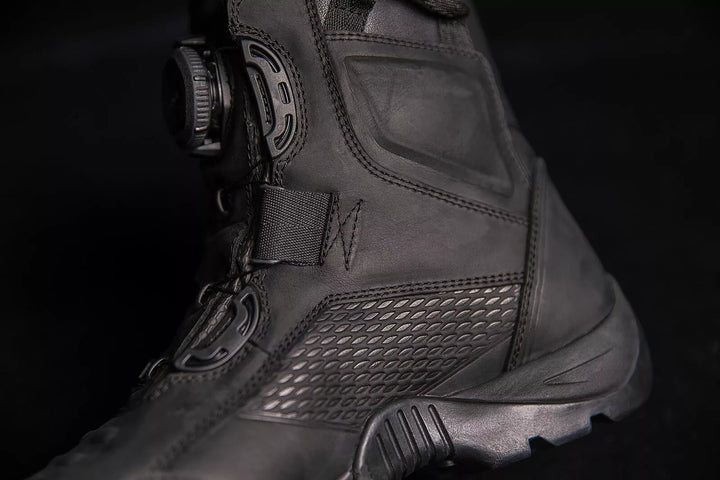 La parte superior de cuero premium cuenta con un acabado resistente al agua, los revestimientos impermeables de eventos transpirables ayudan a que Keet se seque, altamente cariñosos de aceite/ afueras de goma resistentes a la deslizamiento proporcionan un rendimiento máximo en la motocicleta, plantillas de poliuretano de células abiertas, BA. Insertos de doble D3O® de ajuste dual proporcionan cobertura de tobillo, tapas de goma reforzadas, acentos reflectantes del talón y protuberancias de la palanca de cambios