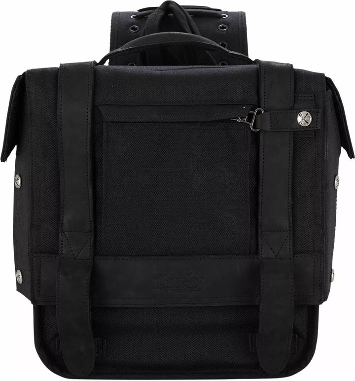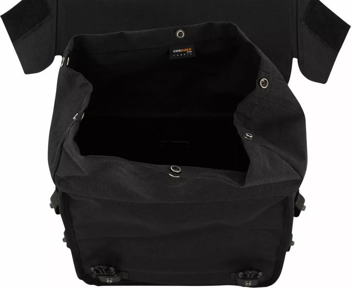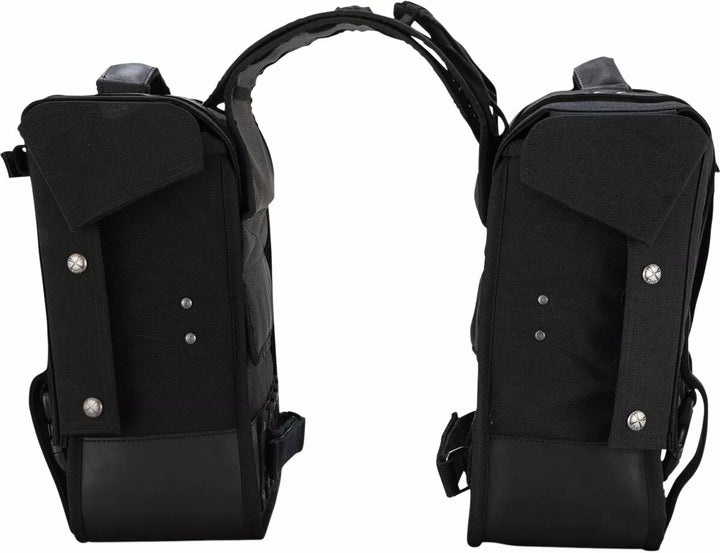 Cierre de la cima de la lista y Snap/Hook-and-Loop, hebillas de velocidad y cremallera de alta calidad "centradas en la moto", sistema uponado anti-flail ", sección de centro de yugo ajustable que mantiene juntas las dos bolsas, con una ancha o estrecha para caber. Su bicicleta en menos de cinco minas, paneles de cuero.