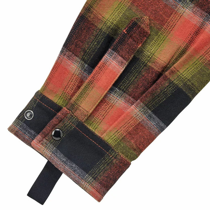 El cómodo algodón de peso 100% pesado de 6.5 onzas., Snaps en placa, puños, collares y aletas de bolsillo se plantean acero inoxidable., Detalles de presión de perlas negras presentados en colores a cuadros. Las puntas de collar tienen instantáneas ocultas para eliminar el aleteo. Abajo sobre las muñecas. El colgajo de bolsillo del pecho tiene una ranura discreta para el almacenamiento fácil de los helados., Recheivele único de poliéster, doble recheivele y costuras de overlock a través de etiquetas interiores bordadas y detalles de fuego exterior.