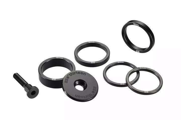 ¡Nevalte tu viaje con el kit de espaciadores de tope y auricular de E*Thirteen! , Reduzca el peso y agregue el estilo de alta gama mientras ajusta su cabina. , Experimente una mayor fuerza y rendimiento con la tapa superior de aleación anodizada y 7075 Al Bolt. , La tapa de aleación liviana de bajo perfil se integra perfectamente con E*trece tallos, pero está igualmente en casa en la mayoría de los tallos del mercado. , Los pernos están brillantemente anodizados en colores para que coincidan con E*más de trece tallos y otros componentes. , Hardware T25 significa ajustes de herramientas individuales de cualquier parte de su*ensamblaje de trece bar/vástago., 5 espaciadores de auriculares de aleación anodizados negros en múltiples tamaños permiten la flexibilidad final en el ajuste de aumento. , Tamaño: 34.8 mm de diámetro., Peso: 33 g/kit., Alcance de suministro: tapa superior, perno de dirección, 1x10 mm, espaciadores de auriculares de aleación anodizadas neodizadas de 2x5 mm y 2x3 mm.