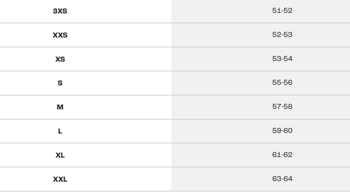 XS (54–55 cm) - S (55–56 cm) - M (57–58 cm) - L (58–59 cm) - XL (60–61 cm) - 2XL (62–63 cm)