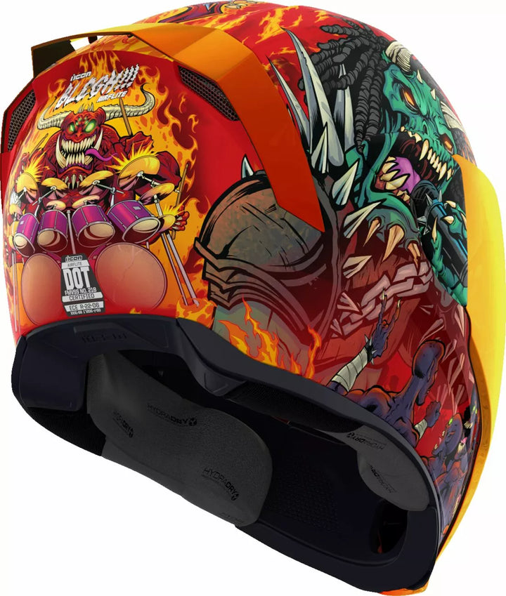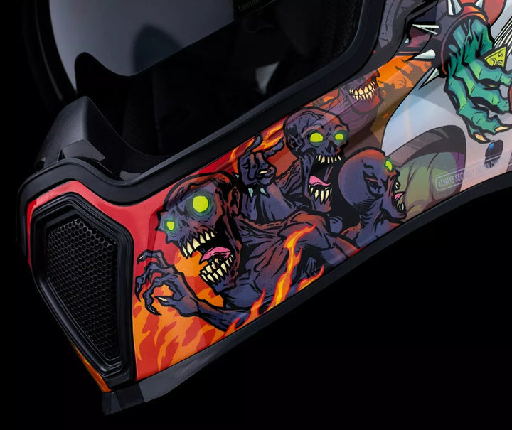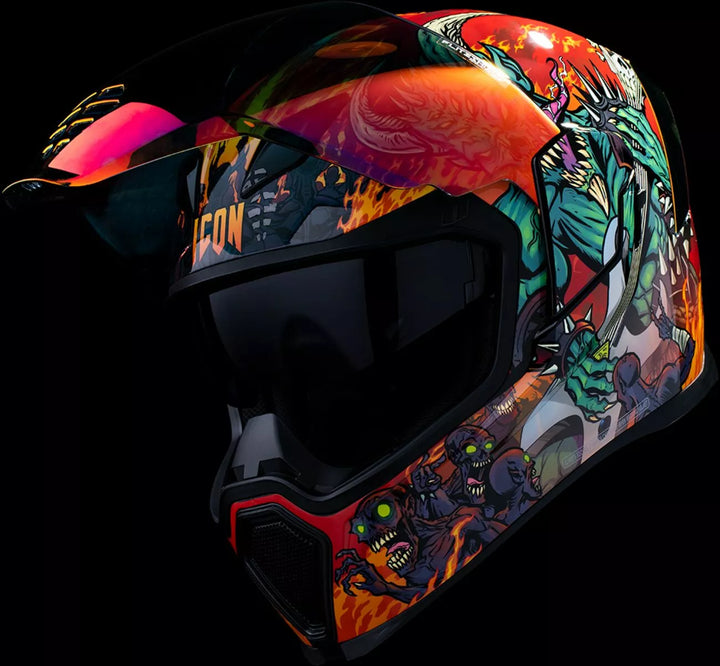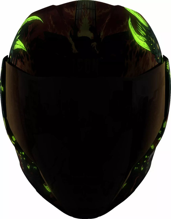 Removable Molded Breath Deflector and Chin Curtain, Injection Molded Polycarbonate Shell for Strength, FAG-FREE Dropshield ™ with Exterior Switch, Recessed Twin Channel Supervent Cooling System, Multiple Oversized Intake Ports Side Plates, The Dropshield ™ Visor Must Only Be Used While the Main Face Shield Is In The Fully Closed Position, Removable Hydradry ™ Moisture Wicking Liner, Glow in the Dark, Internal Speaker Pockets Work With ICON'S R.A.U. Dispositivo Bluetooth, incluye Fliteshield sin niebla transparente y rst sin niebla