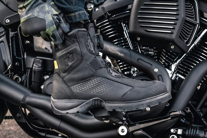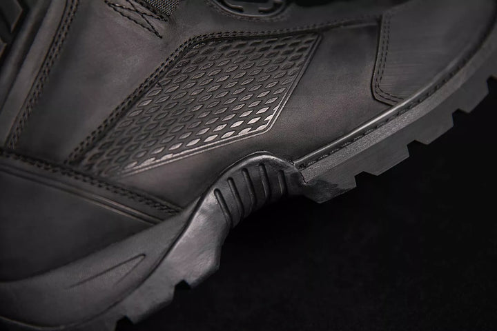 La parte superior de cuero premium cuenta con un acabado resistente al agua, los revestimientos impermeables de eventos transpirables ayudan a que Keet se seque, altamente cariñosos de aceite/ afueras de goma resistentes a la deslizamiento proporcionan un rendimiento máximo en la motocicleta, plantillas de poliuretano de células abiertas, BA. Insertos de doble D3O® de ajuste dual proporcionan cobertura de tobillo, tapas de goma reforzadas, acentos reflectantes del talón y protuberancias de la palanca de cambios