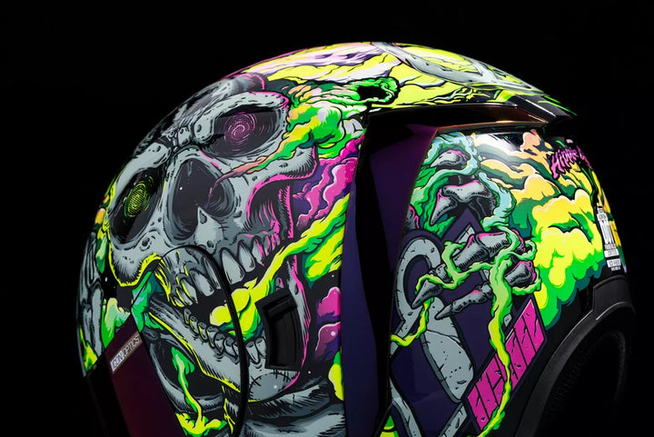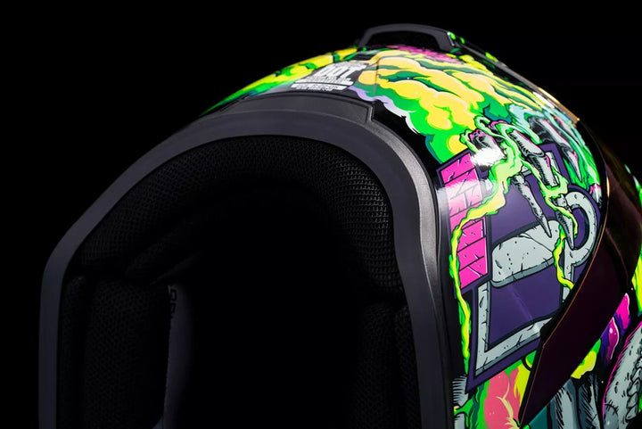 Injection-Molded Polycarbonate Shell for Strength and Durability, Intermediate Headform, Clear Fog-Free Optics ™ Shield Installed, Purple RST FAG-FREE OPTICS ™ Shield Included, Dark Smoke Locking System, PHELOK SHID ™ Removable Comfort Liner, Purple RST Spoiler Kit, Glow in the Dark Graphics, Internal Airflow Geometry, Continuous Venting System, Sculpted NECK Roll, FAG-FREE ICON Optics ™ Shield es con relatación rápida de la posición completamente cerrada, deflector de aliento moldeado extraíble, trabajo de bolsillo interno del altavoz con R.A.U. Dispositivo Bluetooth