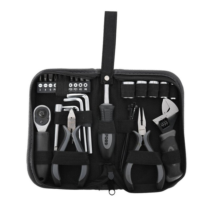Oxford Tool Kit Pro es un kit integral de herramientas de motocicleta premium de 27 piezas. Las manijas de gel suave aseguran que las herramientas sean cómodas de usar y cada una se mantiene en su lugar mediante una correa elástica ajustada dentro de una caja de almacenamiento compacta, ideal para mantener debajo de su asiento trasero. Los enchufes, la barra de extensión y las teclas hexadecimales están hechas de acero de vanadio cromado duradero.