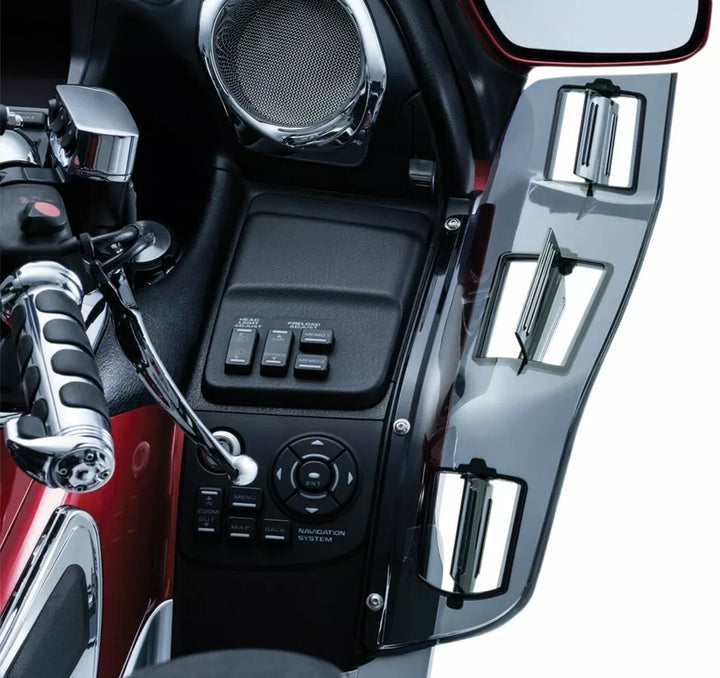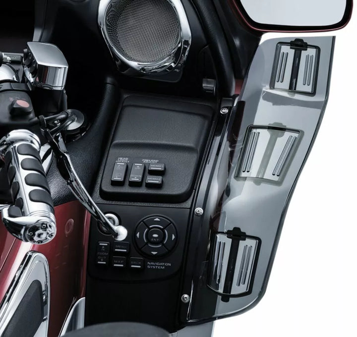 Proporciona protección del viento completa de los espejos hasta los lados del carenado, el flujo de aire se puede dirigir hacia o lejos del jinete o pasajero con tres deflectores de viento ajustables por lado, el mecanismo con el resorte se mantiene en su lugar; Fácilmente ajustado a mano, la construcción de policarbonato con recubrimiento dura oscuro, no use Rain-X u otros productos de limpieza o protección a base de amoníaco en este producto.