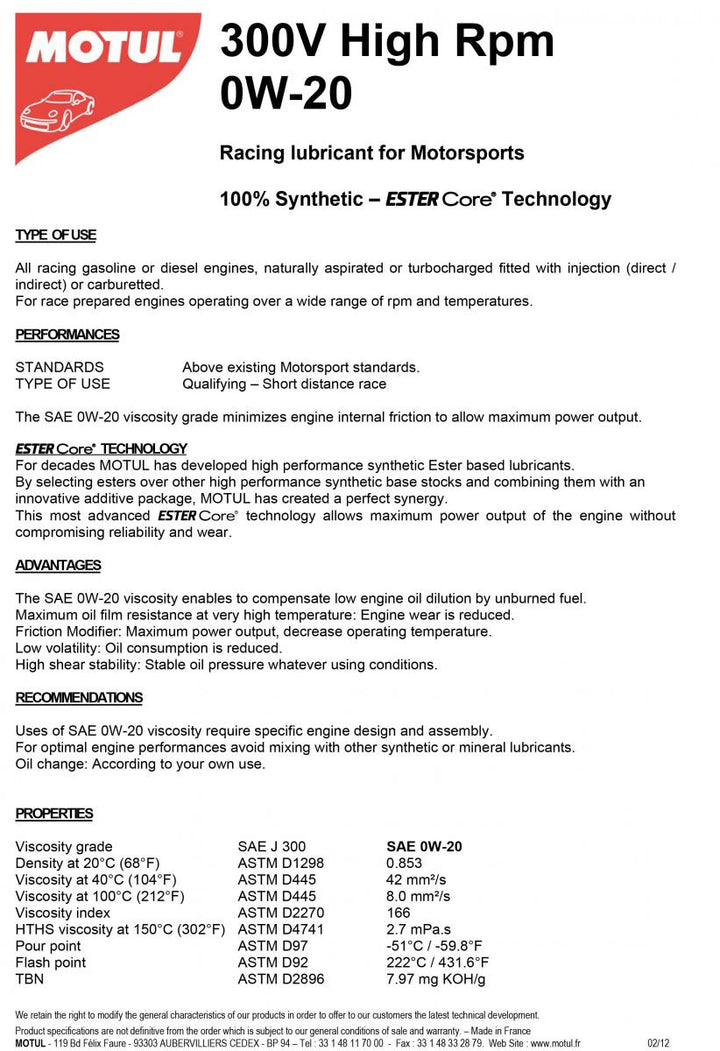 Motul 300V Alto RPM 0W20 2L (10 PC/cartón)