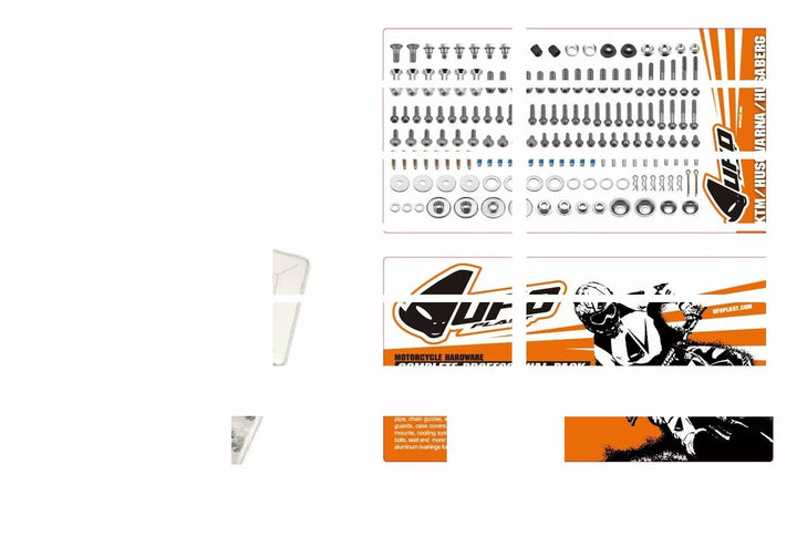 Los kits de hardware de estilo de fábrica se sujetan: todos los plásticos, subcampeado, sistema de frenos, tubería de escape, guías de cadena, sprock, placa y guardias, cubiertas, abrazaderas triples, soportes de barras, sistema de enfriamiento, pernos de pizca de axel, asiento y más