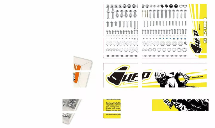 Los kits de hardware de estilo de fábrica se sujetan: todos los plásticos, subcampeado, sistema de frenos, tubería de escape, guías de cadena, sprock, placa y guardias, cubiertas, abrazaderas triples, soportes de barras, sistema de enfriamiento, pernos de pizca de axel, asiento y más