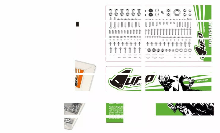 Los kits de hardware de estilo de fábrica se sujetan: todos los plásticos, subcampeado, sistema de frenos, tubería de escape, guías de cadena, sprock, placa y guardias, cubiertas, abrazaderas triples, soportes de barras, sistema de enfriamiento, pernos de pizca de axel, asiento y más