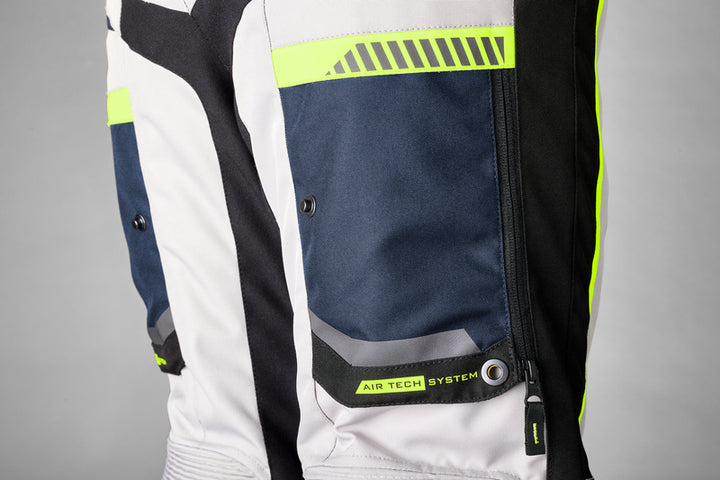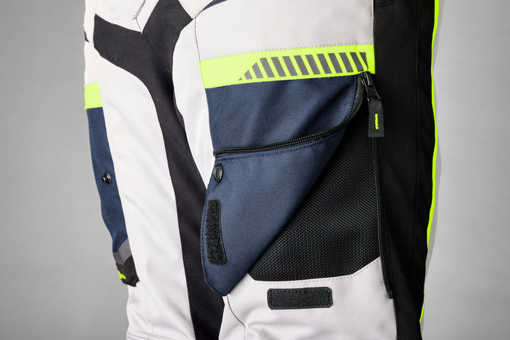 Colección: 2025 Color: Blue & White Género: Hombres Hip_Protection: Sí Homologation: CE Jacket homologado -pants_connection: Sí Knee_protection: Sí Material_apparel: Rango de poliéster: Maverick Evo Reflective_strips: son removalías: son removales: son remoe —nstrips. Sliders: Sin uso: Touring Weather Impermeve: impermeable