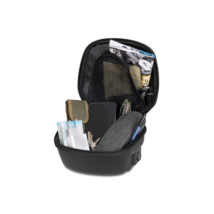 Dentro de su tapa hay un compartimento de malla que se abre con una cremallera y le permite almacenar artículos. Tiene cremalleras adecuadas para su uso con guantes y para bloquear con un candado. El compartimento principal tiene una red para minimizar el movimiento del contenido. Tiene un mango de transporte, correa para el hombro y elementos reflectantes para aumentar su visibilidad a otros vehículos.