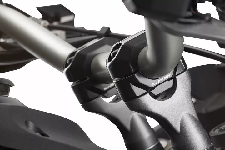 Para una posición más relajada, reemplaza la abrazadera manejable original, para un manillar de Ø 22 mm con un espacio-de orificio de 32-38 mm, incluidos en la entrega, 2 x barra de barra para manillar de Ø 22 mm, 2 x pinzas de manillar, instrucciones de montaje, material de montaje.