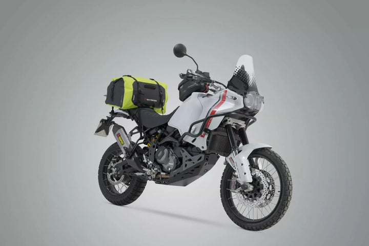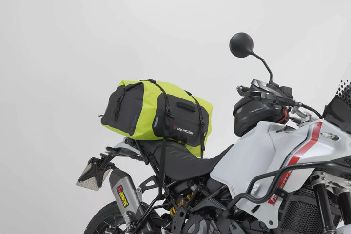 Welded Outer Pocket, Molle Adapter for Attaching Accessory Bags, Universal Fit for Almost All Motorcycles, Made of Sturdy 500D PVC, Waterproof, Extremely Durable Roll, Waterproof, Extremely Durable Handle Lugage Rolla Waterproof Roll Closure and Taped Seams, Reflective Details For Increased Safety On The Road, 1 x Drybag 350 Tail Bag, 4 x Loop Straps, 1 x Adhesive Protective Foil, Mounting Instructions, Size: 58.0 x 28.0 x 28.0 cm / 22.0 cm / 22