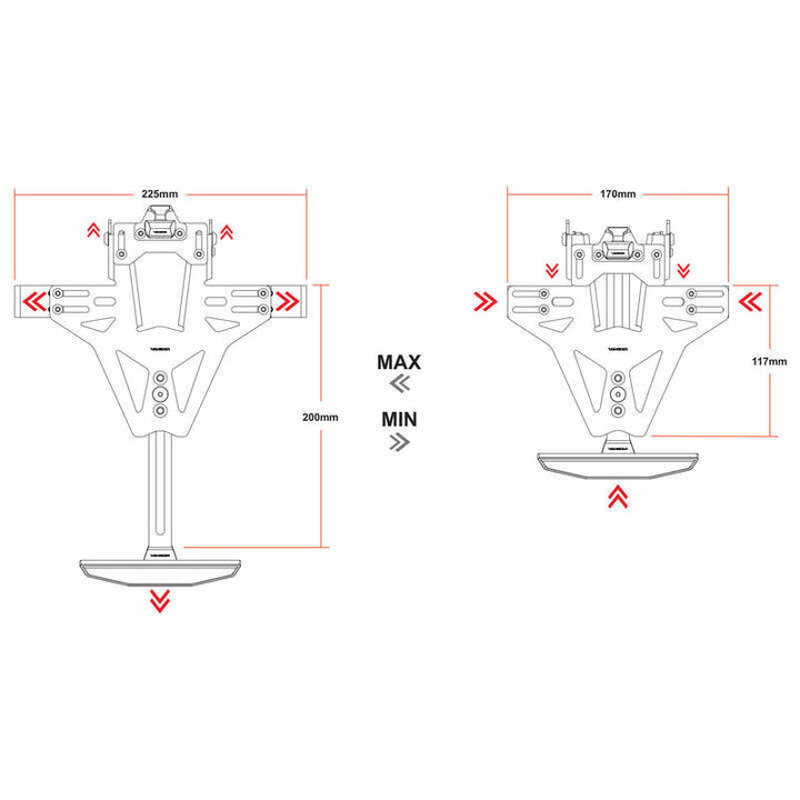 Los soportes de indicadores del Highsider Akron-RS Pro son ajustables en ancho y por lo tanto es adecuado para todos los tipos de indicadores de accesorios. Esta opción de ajuste le permite adaptar la posición de sus indicadores a una amplia variedad de placas. Para permitir que los indicadores se ajusten sin desconectarlos del arnés de cableado, los agujeros de 8 mm se ranuran a un lado.