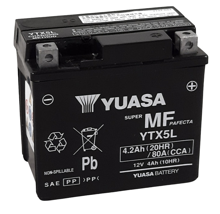 Yuasa YTX5L-FA es uno Batería AGM de alto rendimiento, Factory activada y lista para ser utilizada directamente. Que es perfecto para motocicletas, scooters, quads y otros vehículos más pequeños que requiere Poder de inicio confiable, larga vida útil y mantenimiento mínimo.