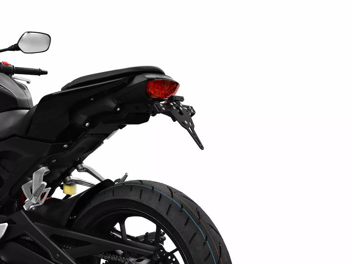 El soporte de la matrícula es extremadamente duradero y a prueba de la intemperie., Polvo negro recubierto. , El soporte de la placa se puede usar para cualquier tipo de placa (ancho de 175 mm)., No se requiere modificación del carenado., Ajuste sin paso del ángulo de rastrillo., Soporte del indicador ajustable en 3 posiciones. Placa., Montajes de luz indicadores especiales (vendidos por separado) requeridos para las luces indicadoras de stock. El kit incluye: 1 soporte de matrícula incl. Kit de montaje, luz de matrícula LED "E aprobado" incl. Soporte, luz de fondo con soporte.