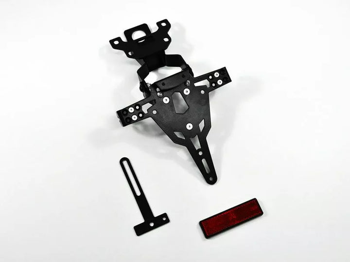 El soporte de la matrícula es extremadamente duradero y a prueba de la intemperie., Polvo negro recubierto. , El soporte de la placa se puede usar para cualquier tipo de placa (ancho de 175 mm)., No se requiere modificación del carenado., Ajuste sin paso del ángulo de rastrillo., Soporte del indicador ajustable en 3 posiciones. Placa., Montajes de luz indicadores especiales (vendidos por separado) requeridos para las luces indicadoras de stock. El kit incluye: 1 soporte de matrícula incl. Kit de montaje, luz de matrícula LED "E aprobado" incl. Soporte, luz de fondo con soporte.