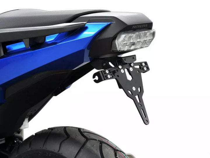 El soporte de la matrícula es extremadamente duradero y a prueba de la intemperie., Polvo negro recubierto. , El soporte de la placa se puede usar para cualquier tipo de placa (ancho de 175 mm)., No se requiere modificación del carenado., Ajuste sin paso del ángulo de rastrillo., Soporte del indicador ajustable en 3 posiciones. Placa., Montajes de luz indicadores especiales (vendidos por separado) requeridos para las luces indicadoras de stock. El kit incluye: 1 soporte de matrícula incl. Kit de montaje, luz de matrícula LED "E aprobado" incl. Soporte, luz de fondo con soporte.