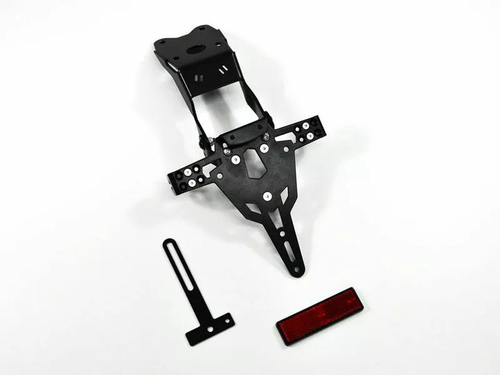 El soporte de la matrícula es extremadamente duradero y a prueba de la intemperie., Polvo negro recubierto. , El soporte de la placa se puede usar para cualquier tipo de placa (ancho de 175 mm)., No se requiere modificación del carenado., Ajuste sin paso del ángulo de rastrillo., Soporte del indicador ajustable en 3 posiciones. Placa., Montajes de luz indicadores especiales (vendidos por separado) requeridos para las luces indicadoras de stock. El kit incluye: 1 soporte de matrícula incl. Kit de montaje, luz de matrícula LED "E aprobado" incl. Soporte, luz de fondo con soporte.